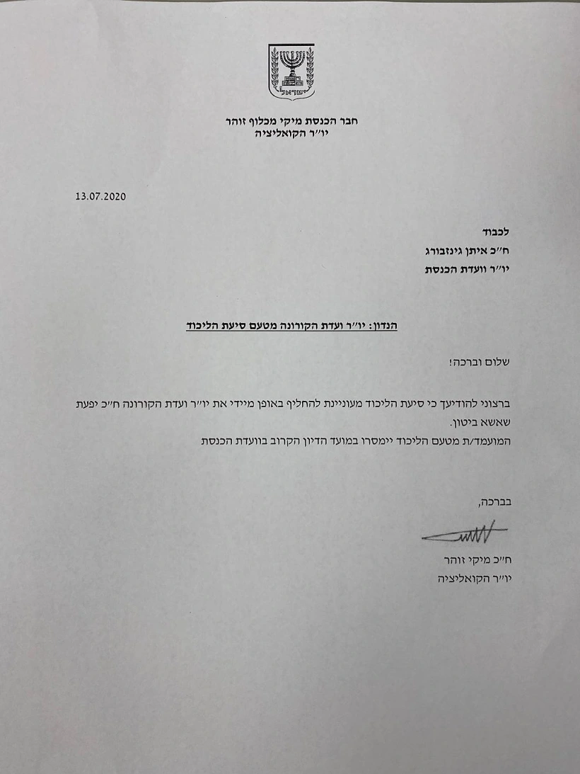 מיקי זוהר בפנייה ליו''ר ועדות הכנסת איתן גינזבורג: ''הליכוד מעוניינת להחליף את יפעת שאשא ביטון כיו''ר ועדת הקורונה'' | צילום: חדשות 13