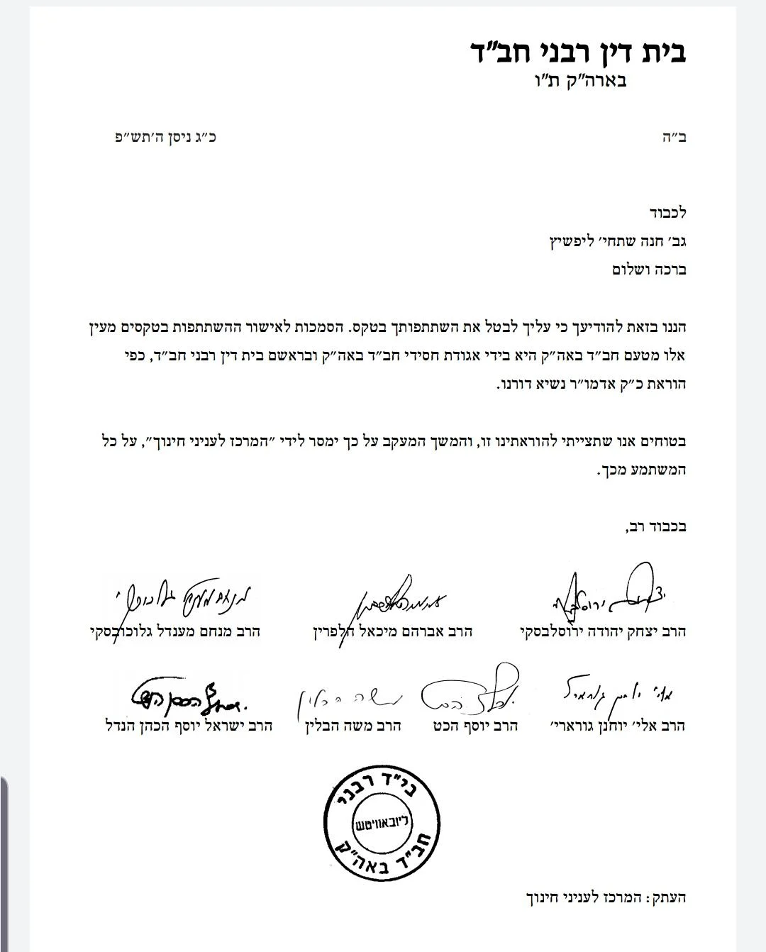 מאגודת חסידי חב"ד נמסר: "הסמכות לאישור ההשתתפות באירועים ציבוריים מטעם חב"ד באה"ק, היא בידי אגודת חסידי חב"ד, ובראשם בית דין רבני חב"ד, כפי הוראת כ"ק אדמו"ר נשיא דורנו. תנועת חב"ד, שמפעילה אלפי מוסדות ובתי חב"ד של שליחים מסורים, חייבת לפעול אך ורק על פי הפרוטוקול והסדר שהטמיע בה הרבי בעצמו, וכל עקיפה של הסדר הנ"ל, עלולה לפגוע בעבודה הנפלאה והחשובה שנציגי חב"ד ברחבי העולם עושים מידי יום ביומו. אנו מודים לצוות בראשותה של השרה מירי רגב על הרצון להעריך את העבודה המרשימה שנעשית בכל העולם כדי לחבר את כל גווני עם ישראל, ונמשיך לעשות ככל יכולתנו כפי שציווה עלינו הרבי לאורך כל השנים".