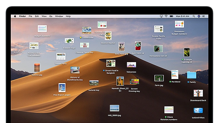 ארגנו את קבצי שולחן העבודה בקבוצות מסודרות באופן אוטומטי, ערימות מאפשר לארגן את קובצי שולחן העבודה בקבוצות מסודרות באופן אוטומטי. החל מ-macOS Mojave תוכלו להשתמש בערימות (Stacks), לסידור וארגון שולחן העבודה בערימת של קבצים המחולקים על פי קטגוריה. הנה דוגמה לשולחן עבודה מבולגן:
