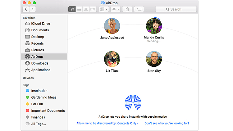 העבירו קבצים במהירות למכשירי Apple שבסביבתכם (מק לאייפון, אייפד לאייפון וכן הלאה) גם ללא חיבור לרשת. הקבצים יעברו במהירות וללא כיווץ או שינוי בגודל. אז איך זה עובד? ובכן, לחצו על ׳עבור אל׳ (או Go) > AirDrop . או בחרו ב-AirDrop מתפריט הצד בחלון ה-Finder שלכם. חלון ה-AirDrop מראה את משתמשי AirDrop שבסביבתכם. פשוט גררו מסמך אחד או יותר לנמען בחלון הפתוח.
