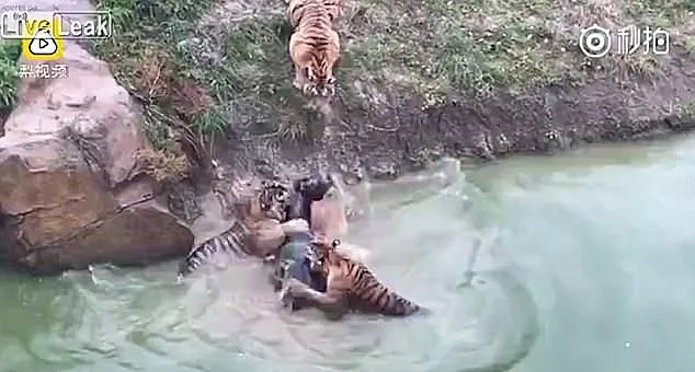 דקות לאחר כניסתו למים, החמור הותקף על ידי שני הנמרים הקרובים למכשול המים כשהשלישי לא מאחר להצטרף לחגיגה.