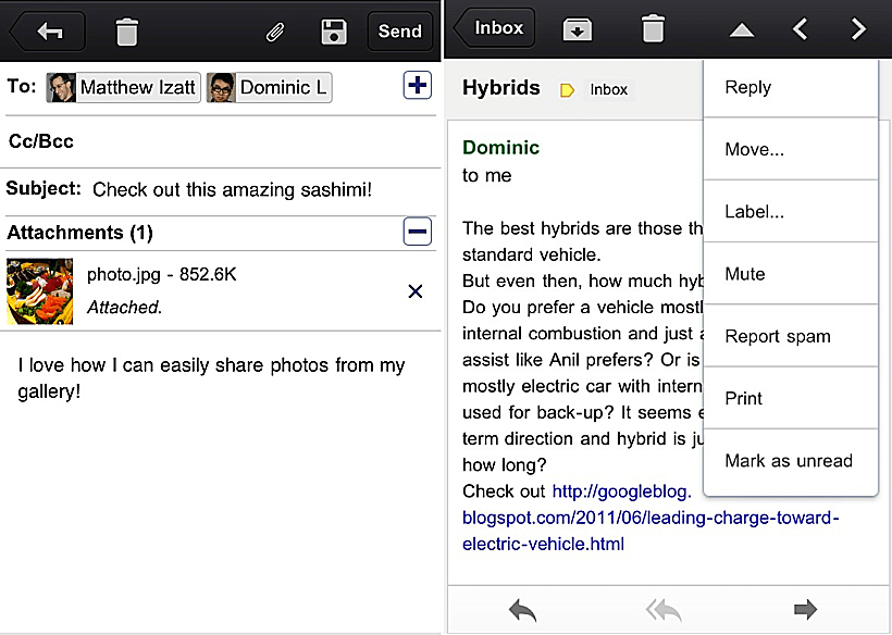 האפליקציה החדשה, כפי שניתן לראות מהתמונות ששוחררו בבלוג של גוגל, היא שילוב של הטוב בין כל העולמות: מצד אחד - אפליקציה ייעודית ומהירה, שמעוצבת כמו שצריך, שולחת התרעות לנייד כשמגיע מייל חדש וכו', ומצד שני - חיבור ישיר ורשמי למייל של גוגל, על כל תכונותיו הרבות.