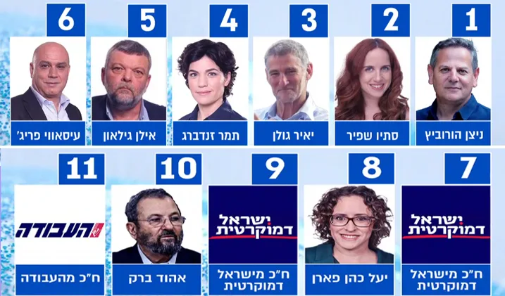 הרכב הרשימה המסתמן: 1. ניצן הורוביץ 2. סתיו שפיר 3. יאיר גולן 4. תמר זנדברג 5. אילן גילאון 6. עיסאוי פריג׳ 7. ישראל דמוקרטית 8. יעל כהן פארן 9. ישראל דמוקרטית 10. אהוד ברק 11. ח"כ מהעבודה 12. מוסי רז.