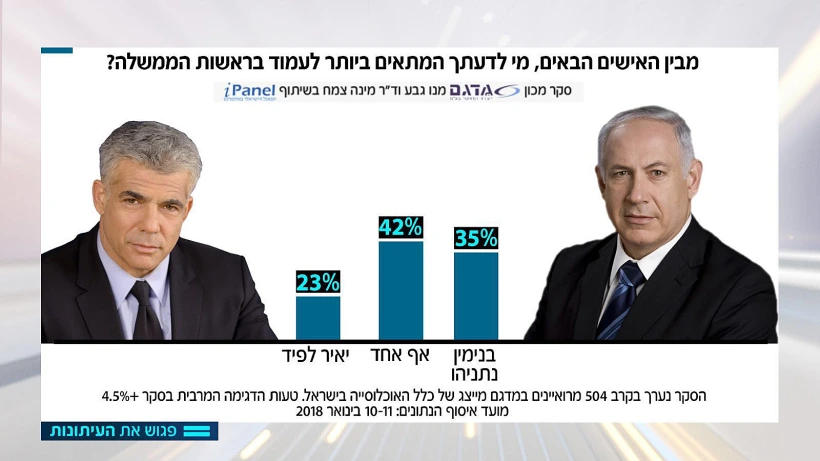 כשהשוונו בין ראש הממשלה נתניהו ליושב ראש יש עתיד ח״כ יאיר לפיד גילינו שנתניהו מקבל 35%, לפיד 23% והשאר 42% לא יודעים או מסרבים להשיב או שסבורים שאף מועמד לא מתאים.