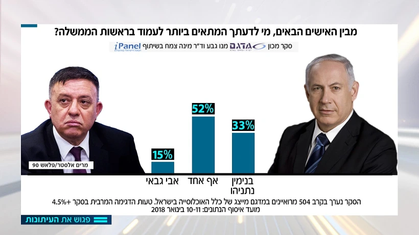 בנוסף, בדקנו אפשרות שנדונה בימים אלו במערכת הפוליטית: ריצה משותפת של ״יש עתיד״ של יאיר לפיד עם ״כולנו״ של משה כחלון. לפי הסקר מפלגה כזאת תהיה הגדולה ביותר עם 29 מנדטים. בשאלת ההתאמה לראשות הממשלה. תחילה השוונו בין ראש הממשלה נתניהו ליושב ראש המחנה הציוני אבי גבאי. נתניהו קיבל 33%, גבאי 15% והשרר סירבו להשיב, לא ידעו או שאמרו שאף אחד מהמתמודדים לא מתאים.