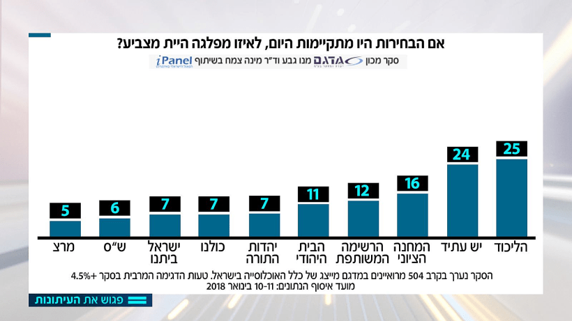 סקר המנדטים של ״פגוש את העיתונות״: הליכוד בראש עם 25 מנדטים, יש עתיד עם 24 והמחנה הציוני ממשיך לדשדש עם 16 מושבים בלבד.