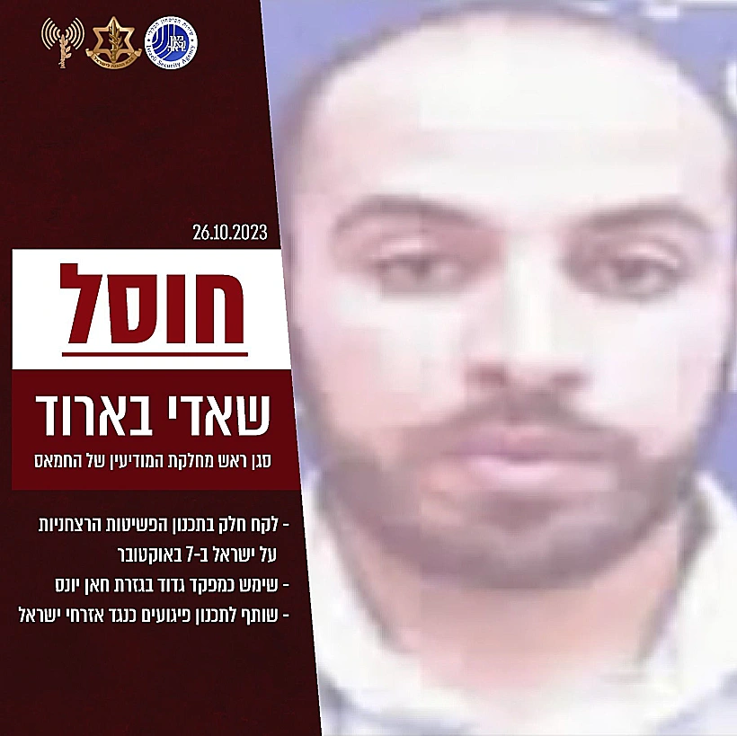 מטוסי קרב בהכוונת מידע מודיעיני מדויק של אמ"ן ושב"כ, חיסלו היום את סגן ראש מחלקת המודיעין של חמאס, שאדי בארוד.