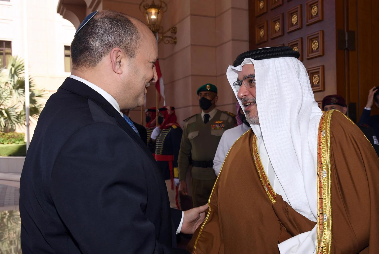 ביקורו ההיסטורי של רה"מ בבחריין: ראש הממשלה נפתלי בנט נועד היום (שלישי) עם יורש העצר וראש ממשלת בחריין, סלמאן בן חאמד אל-ח'ליפה, בארמונו. הוא התקבל במקום על ידי משמר הכבוד בטקס קבלת פנים רשמי, על רקע המנון התקווה וההמנון הבחרייני - לצד דגלי שתי המדינות.
