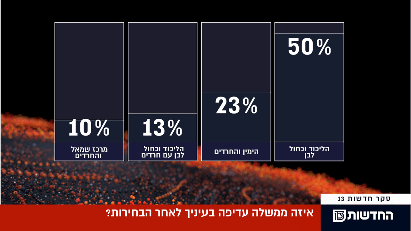 סקר חדשות 13: גוש המרכז-שמאל מוביל, 50% רוצים ממשלת אחדות