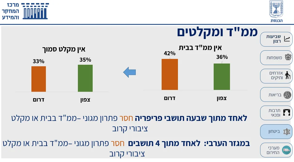 מנתוני מרכז המחקר והמידע של הכנסת עולה כי 40% מתושבי הפריפריה אינם חשים ביטחון באזור מגוריהם, ל-42% מאוכלוסיית הדרום אין ממ"ד בבית - וכשליש גרים ללא מרחב מוגן סמוך