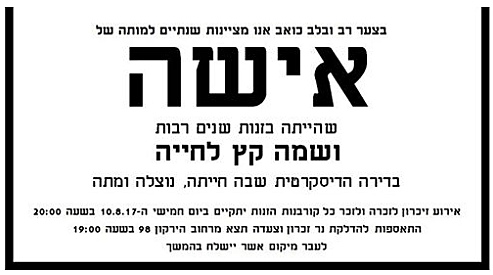 עו"ד אביטל רוזנברג סרי, מצביעה על הנקודה שבה חל השינוי התודעתי בקרב הציבור: "לפני שנתיים אירע אירוע מכונן שבו התאבדה אישה בזנות בבית הבושת שבו היא עבדה בו רחוב בירקון בתל אביב. מאז מיסדנו את עצרת הזכרון השנתית לנשים שמתו בזנות שתתקים השנה ב-10 באוגוסט. הציבור הבין שזנות היא לא בחירה והיא לא הכסף הגדול שמדברים עליו, זה אונס ומציאות נוראה".