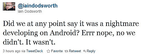 גם מנכ"ל TweetDeck לא נשאר חייב, וצייץ הודעה זועמת משלו בה הבהיר מעל לכל ספק שג'ובס שם מילים בפיו, וכי הוא מעולם לא התלונן שזה סיוט לפתח לאנדרואיד - פשוט משום שזה לא כך. כל צוות האנדרואיד שלו, הוא אמר, כולל שני מפתחים בלבד, כי לא צריך יותר מזה.