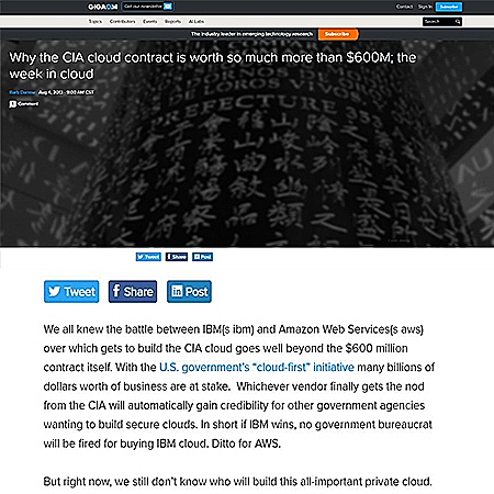 המאמר המדובר מכונה "Why the CIA cloud contract is worth so much more than $600M", ועוסק בחוזה הענק שחתמו ב-CIA עם חברת אמאזון בתמורה לאספקת שירותי ענן לסוכנות הביון. על פי החוזה ההוא, ב-CIA לראשונה העבירו את חלק מפעילות המיחשוב שלהם לענן חיצוני שהופעל על ידי חברת אמאזון. למהלך הזה היו המון מבקרים בזמנו, שעיקר טענתם היה על רמת אבטחת המידע של הסוכנות - מאבק שייתכן ויתחדש בקרוב.