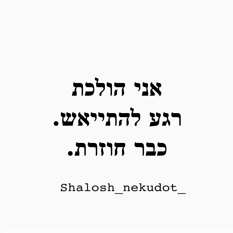 "חיוביות מאוד. הספר יצא לפני חצי שנה, ומעט לאחר מכן נרשמתי לבית הספר בצלאל לאומנות בירושלים. אני אמנם עוסקת שם בעיקר באומנות חזותית, אולם מצאתי שגם המילה הכתובה יכולה להיות יפה מבחינה ויזואלית, ואת הסגנון הזה אני משלבת בספר וכן בעמוד האינסטגרם שפתחתי תחת השם שלוש נקודות. אני מקבלת פידבקים חיוביים גם על הכתיבה וגם על הויזואליות. באינסטגרם אני רואה המון אהבה; אני חושבת שהיא נובעת מכך שהכתיבה שלי מאוד מדברת לשכבת הגיל שלי, שאולי לא קוראת את הספרות והשירה הקלאסית, ומוצאת בעמוד שלוש נקודות תרבות מונגשת יותר, שמתאימה יותר לצייטגייסט, לרוח התקופה".