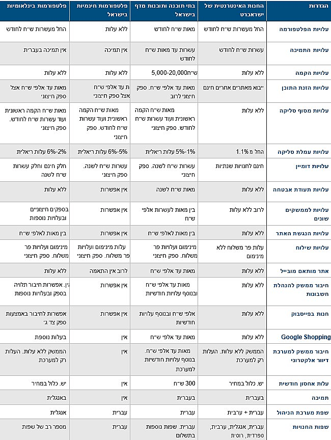עלויות הקמה - כמה יעלה לכם דמי הקמה ראשוניים, כדי שהחנות תהיה באוויר. העלויות כוללות את התהליך שבין תחילת הפעילות ועד לשלב שבו אפשר למכור. הן לא כוללות לרוב את הזנת התוכן, קרי המוצרים לתוך הפלטפורמה.