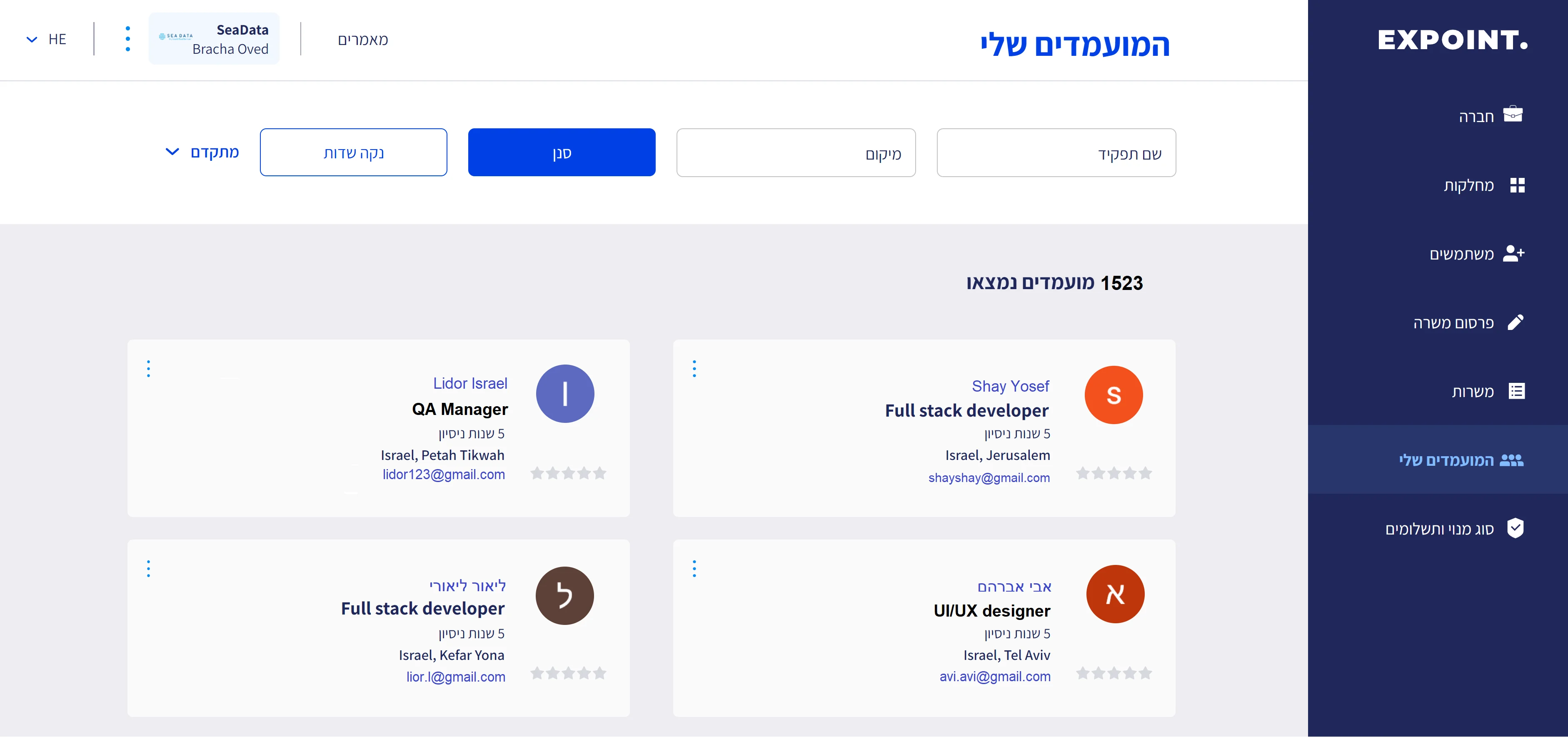 Expoint היא זירה שמרכזת גם משרות דרושים בהייטק וגם מחפשי עבודה ופרילנסרים בתחומים שונים. כך, המגייסים לא חייבים להסתפק בפרסום משרות והמתנה לקורות החיים – אלא יכולים לחפש בעצמם מועמדים שמתאימים להם – על פי שורה ארוכה של קריטריונים ופילוחים שרלוונטיים להם.