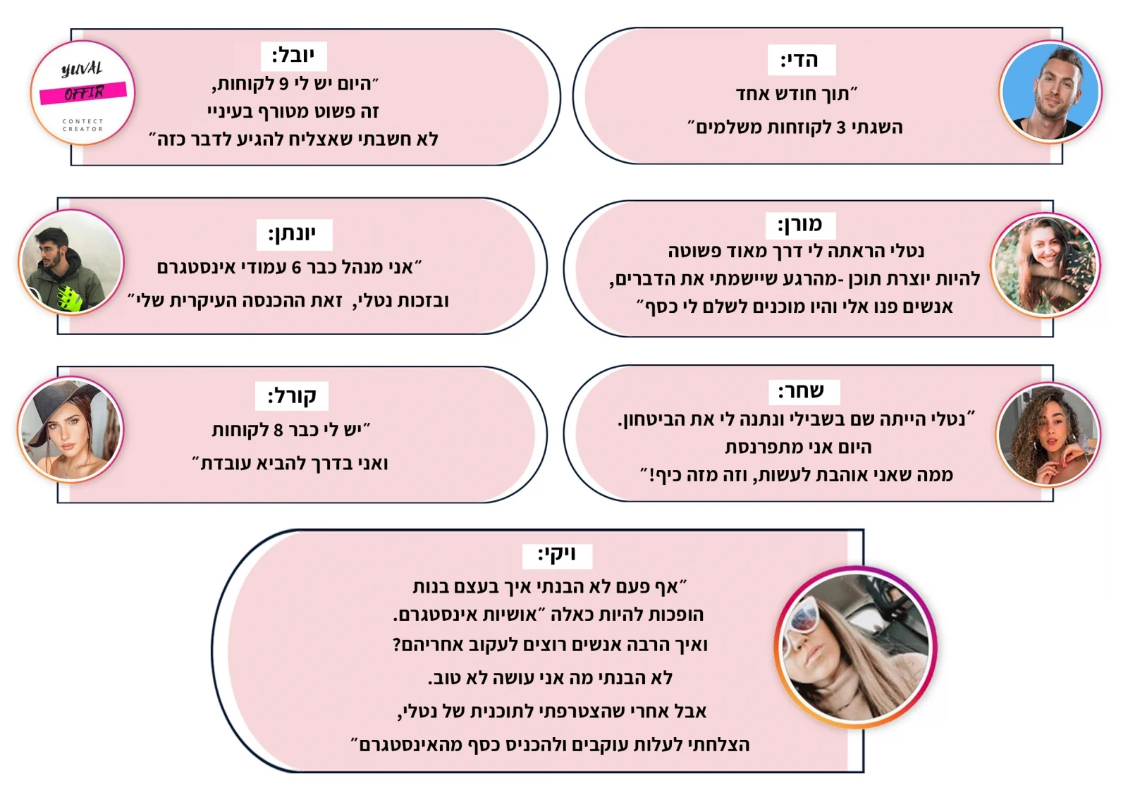 "אני לא מלמדת להפוך לאושייה. אני מראה איך אפשר לעזור לבעלי עסקים, בכך שאת יוצרת להם תוכן דרך האינסטגרם. תוכן שמביא להם לקוחות ובתמורה את מייצרת הכנסה של אלפי שקלים ממשהו אמיתי שכיף לעשות כמו… לבלות באינסטגרם. ככה נוצר ביטחון בהכנסה שלך, ולא רק ביטחון - גם הלייף סטייל עם החופש להרוויח מכל מקום בעולם"