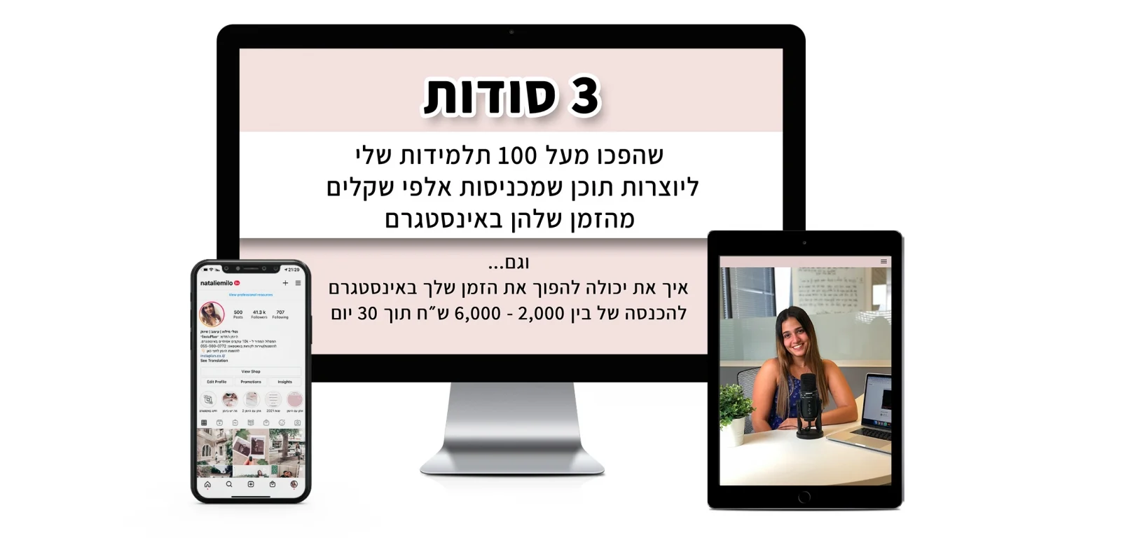 "אחרי שהפכתי מעל 100 נשים ליוצרת תוכן שמכניסות אלפי ועשרות אלפי שקלים מהזמן שלהן באינסטגרם, הכנתי הדרכה מקיפה בחינם לגמרי (לקוראי רשת 13 בלבד) עם שלושה סודות שכל יוצרת תוכן מצליחה עושה".