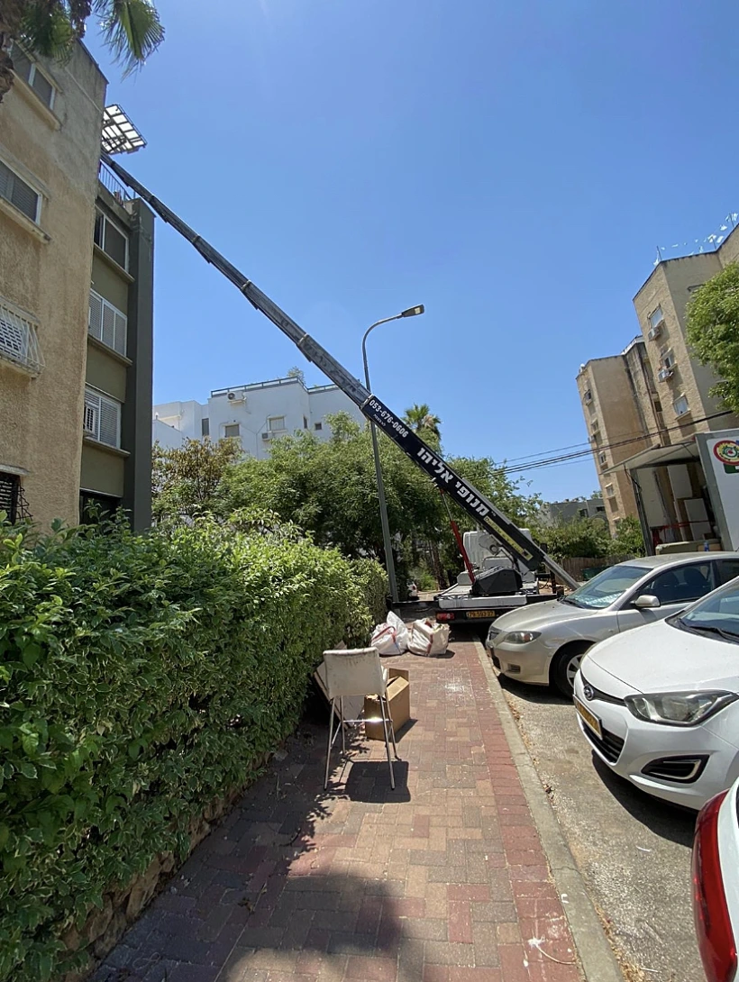 השירות אותו אני מעניק בעזרת המנוף הזה נועד להעביר ציוד קל וכבד עד קומה תשיעית, בין אם מדובר בבניין מגורים או בניין משרדים. בנוסף אני זמין לתת שירות גם בכל הנוגע לפסולת בניין, פרגולות ועוד".