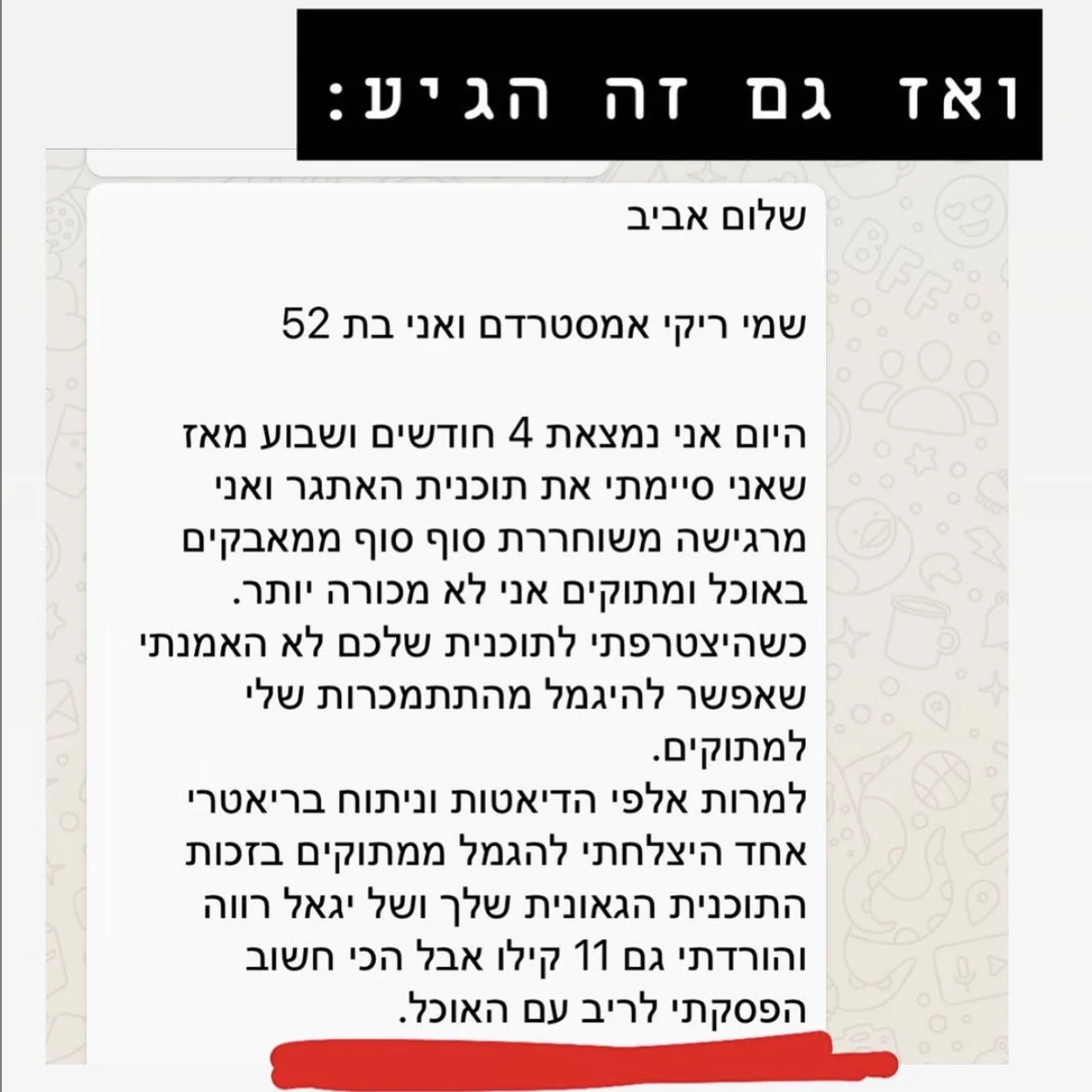 "התהליך שהלקוחות עוברים אצלנו נמשך תשעים יום, שבסוף התוכנית הם כבר בעולם אחר לגמרי: הם רזים, אנרגטיים והכי חשוב, הם הורידו את התלות שלהם בפיתויים.