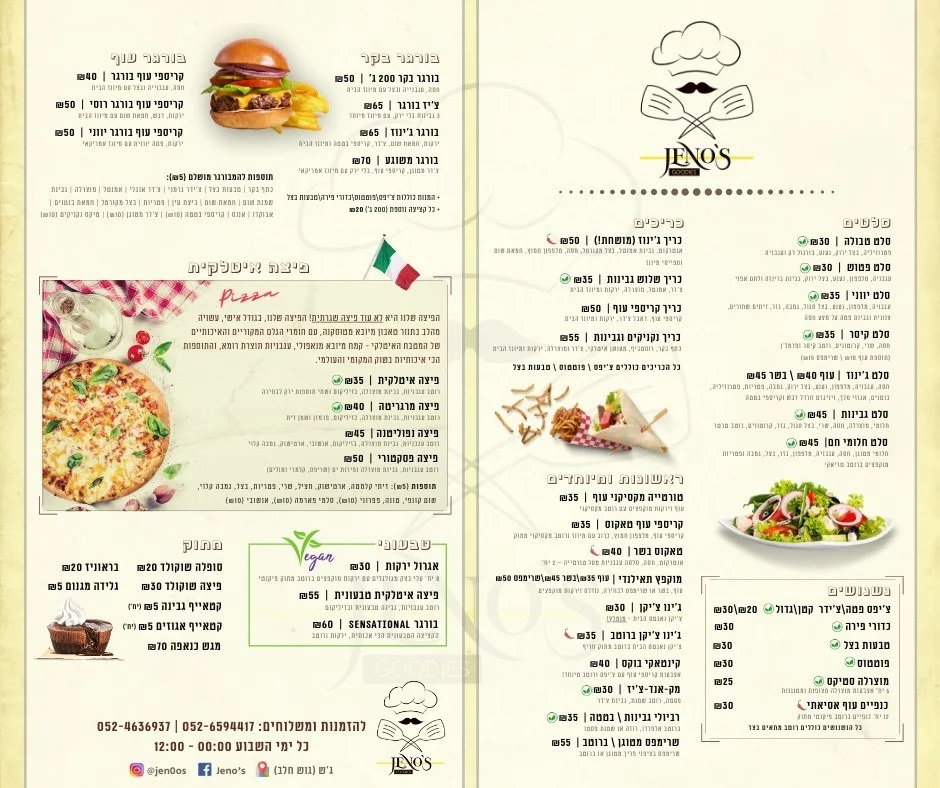 במסעדת Jeno's ניתן למצוא מבחר רב של מנות ממטבחי העולם שעם עצימת עיניים והתענגות על הביס בפה, תתקשו לגלות שאתם לא נמצאים במדינת אחרת בעולם באותו הרגע. בין הארצות המככבות בתפריט Jeno's תוכלו למצוא את מקסיקו, איטליה, אמריקה, רוסיה, לבנון, מזרח אירופה וארצות נוספות שתזכו לטעום ממטבחיהן בשיחת טלפון אחת לביצוע הזמנה ישירות מהמסעדה. בנוסף, צמחונים וטבעונים יוכלו ליהנות גם הם משפע מנות נהדרות.