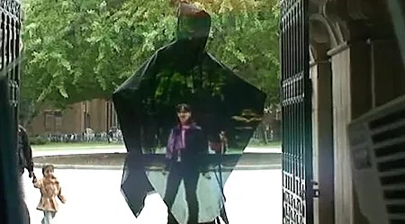 השיטה הראשונה מוגבלת מאד על ידי הפרמטרים הטכניים של המסכים והמצלמות שאנו מסוגלים לייצר, ובוודאי שאינה מתאימה ליצירת גלימה שתהפוך את בעליה לרואה ואינו נראה מכל זווית הסתכלות. עם זאת, אפשר בהחלט לדמיין "העלמה" אסתטית של מתקנים סטטיים ומכוערים כמו ארונות חשמל, אנטנות סלולריות, פרוייקטי בניה מפוקפקים בערים מרכזיות ועוד. בתמונה הבאה אפשר לראות פרויקט של חוקר יפני בשם סוסומו טאצ'י (Tachi), בו תמונה שמצולמת במצלמת וידאו, שנמצאת מאחורי דמות ה"רפאים", מוקרנת בזמן אמת (ומלפנים) על הגלימה שלה. חלק גדול מהאפקט מושג בזכות תנאי התאורה הספציפיים.
