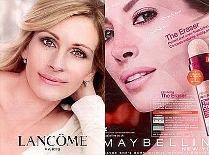 השחקנית משמאל, ג'וליה רוברטס המקורית, ניחנה ביופי טבעי אך פגמיה (היפים אף הם) גם ברורים לעין. השחקנית מימין מתבססת על דמותה של רוברטס במציאות אך מדובר בפייק, תמונה דיגיטלית של אשה מושלמת שלא קיימת במציאות ועתה גם נאסרה לפרסום בבריטניה. במקביל נפסלה לפרסום מודעה של דוגמנית העל כריסטי טרלינגטון עבור Maybelline, אף הוא מותג של לוריאל.