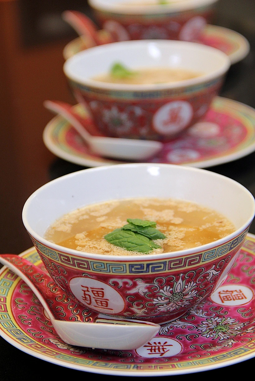 קינוח מתוק ומפתיע • אהרוני מכין מרק חם, מתובל ומתקתק של ג'ינג'ר ולמון גראס עם כופתאות קטנטנות שעשויות מקמח אורז. מגישים עם אגוזי מלך קלויים ועלי נענע טריים