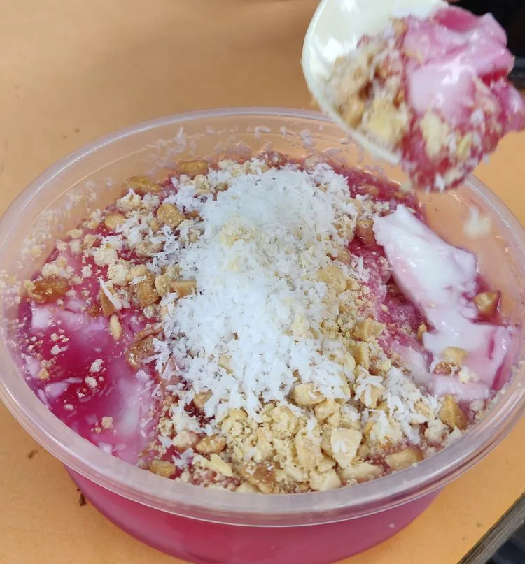 נתבקשנו לבחור בין מלבי חלבי לטבעוני – ולקחנו גם וגם. המלבי מגיע כעת בצלחת חד"פ (דאם יו, קורונה), עליו ניתן לזלף, בנוסף לסירופ מי הורדים האדום והמוכר – גם סירופים יחודיים אחרים כמו סירופ קרמל, לימון הל ווניל קינמון. אמרו לנו שהלימון הל הוא למבינים – אז לקחנו אותו, וגם את הוניל קינמון. הקרמל יאלץ לחכות לפעם הבאה. הטופינגס כללו בנוסף לאלה הרגילים גם שברי עוגיות של אמא של עוזי (אישה יקרה מסתבר – כי זה טעים אש!) ובוטנים מלוחים. לקחנו.