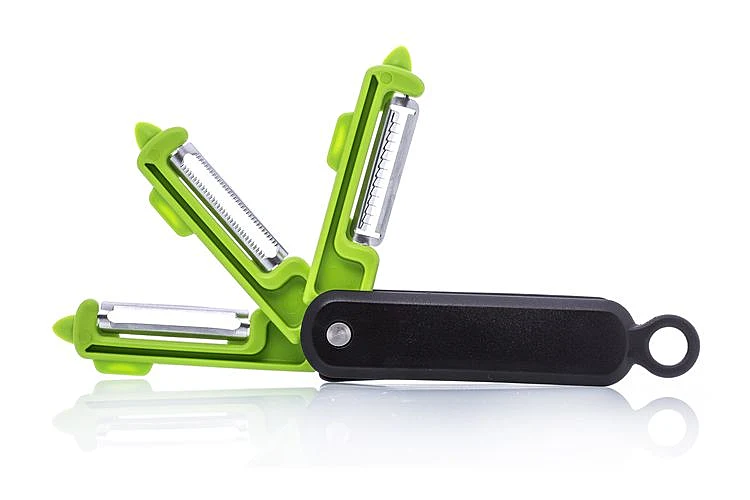 האולר הזה הוא בעצם קולפן בעל שלושה להבים – לקליפות קשות (תפו"א, מלפפון, גזר), קליפות רכות (עגבניה) וחותך ירקות בצורת גפרורים (ג'וליאנים). להבי הקולף עשויים מנירוסטה איכותית וקצה כל להב מאובזר במסיר "עיני" תפוחי אדמה. לאחר נסיון הבנתי שהפריט מיועד רק לימניים, כל השמאליים יגלו כי כמעט בלתי אפשרי לעבוד איתו. מחיר מומלץ לצרכן: 39.90 שקלים, בחנויות כלי הבית המובחרות.