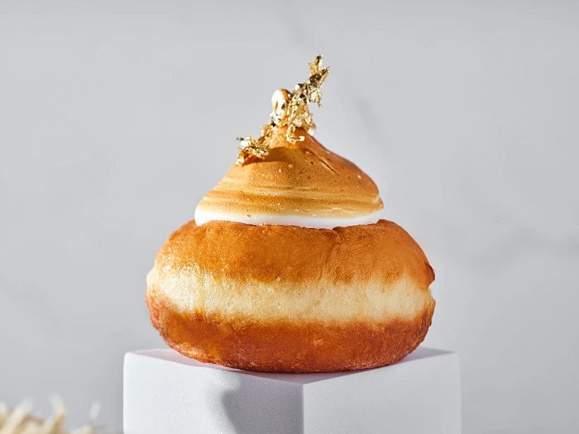 לפני הכל, שאפו ענק לעיצוב הכל כך מרשים ומושקע. כל אחת מסופגניות הקולקציה הייתה יותר יפה מהשנייה, וכולם התנאו בכמה קומות ובשכבת קרם מגרה. מבין רשימת הטעמים שמשלבת בין קלאסיקות דוגמת ריבת חלב ותות לטעמי ממתקים דוגמת קינדר בוואנו, בננה לוטי ואפילו נוצ'ולה מקופלת - אהבנו את סופגנייה במילוי קרם פיסטוק. הבצק היה אוורירי ונעים, והמילוי קליל במרקמו ולא מתוק מדי, בדיוק כמו שמילוי צריך להיות. את הכל ציפה גנאש שוקולד פיסטוק, כשאת היצירה חתם פונפון קרם וניל עם מרנג פריך וטוויל פיסטוק.