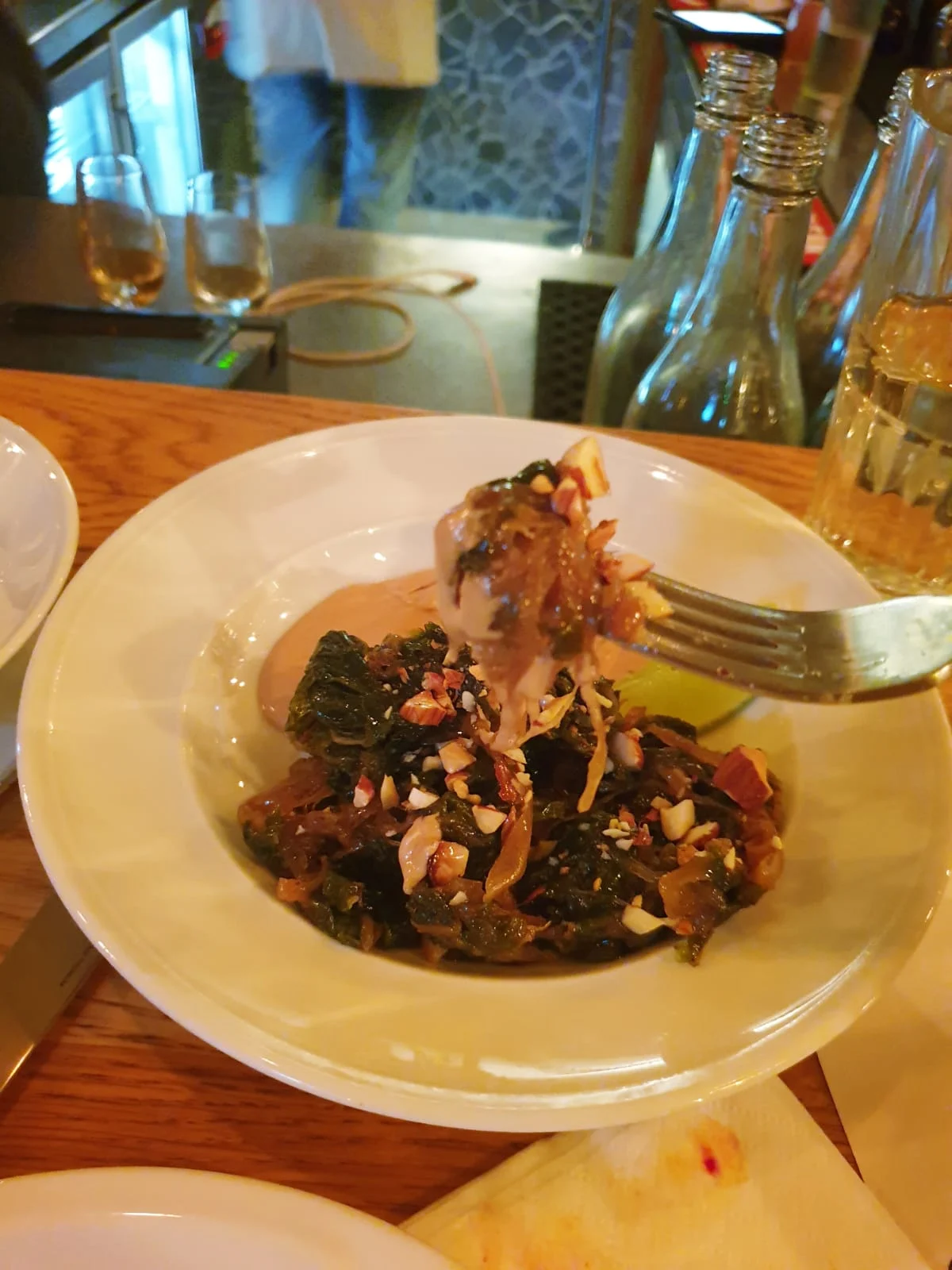 סלט עשבי ים – כמה פשוט ככה מענג – אצות, בצל מקורמל, טחינה אדומה ושקדים – עוד מנה מיוחדת שחוסלה ברגע.