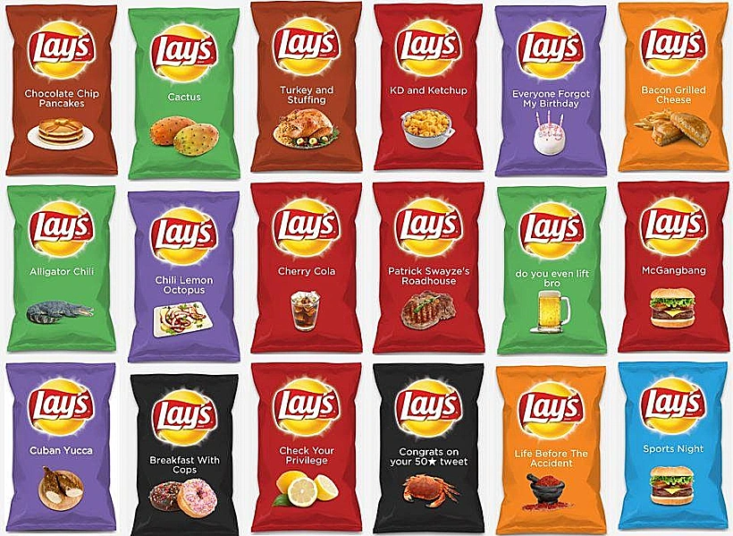 חברת Lay's האמריקאית ערכה תחרות לאומית בניסיון לבחור טעמים חדשים. ארבעת הפיינליסטים שנבחרו הציעו טעמים מוזרים לחלוטין