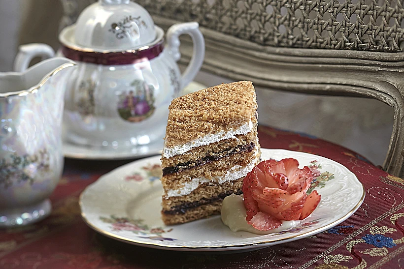 גם התפריט, כמו העיצוב, מכיל בעיקר מטעמים וטעמים ביתיים והוא מבוסס על מתכונים עתיקים של המשפחה, אותם הביאו מחבל ראצ'ה ההררי, השוכן מזרחית לאזור הים השחור, והידוע ביין ובקולינריה השופעת שבו.