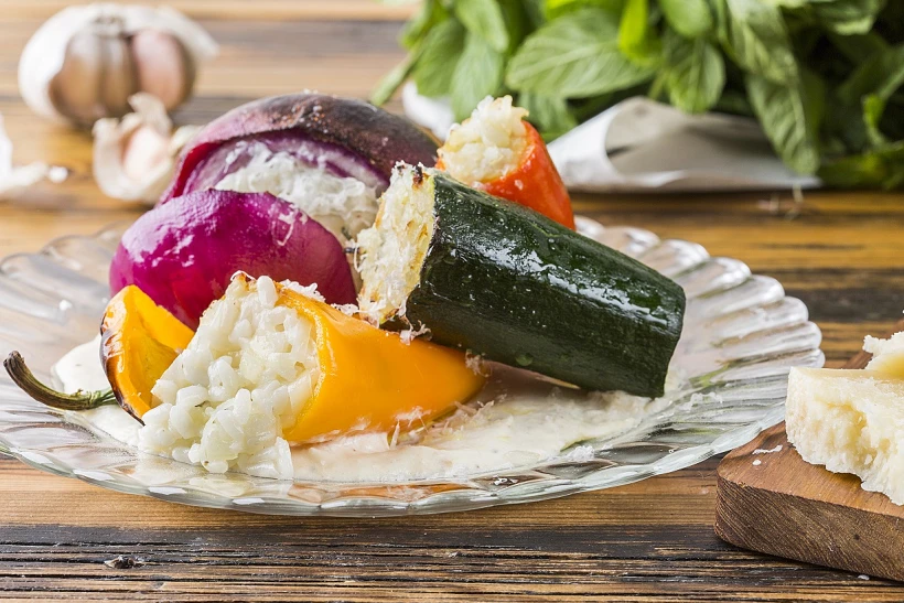 1. ירקות ממולאים בריזוטו פרמז'ן מונחים על רוטב שמנת עיזים מבחר ירקות גינה ממולאים בריזוטו פרמז'ן אפויים בתנור בזיגוג שמן זית, על מצע של רוטב שמנת עם גבינת מה-עז