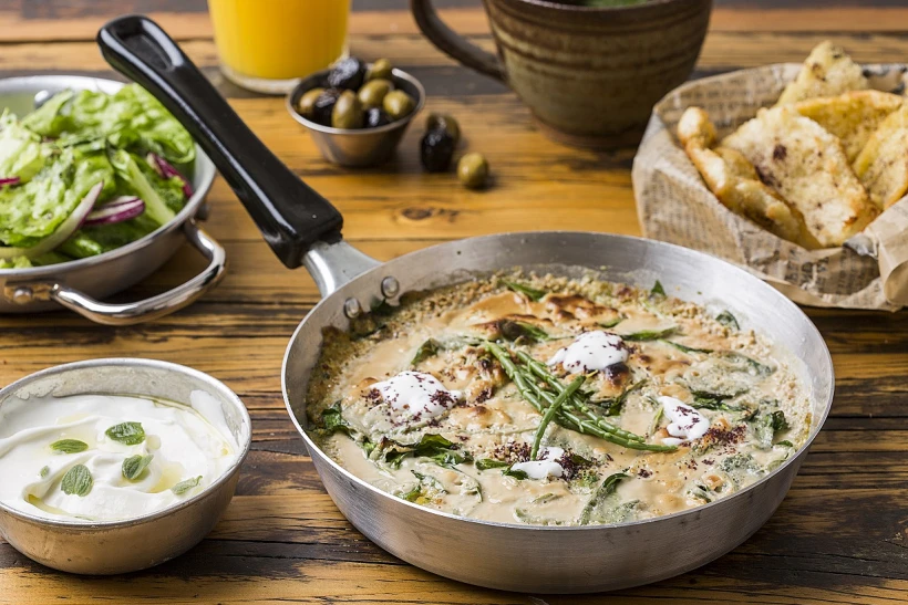 תערובת חלומי, בצל, פטרוזיליה, חציל קלוי ותבלינים, מונחים במחבת אפייה עם עגבניות, תרד וטופינג מלא של טחינה גולמית.