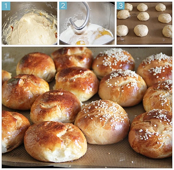 בכל פעם שאני מכינה חלות , לחמניות ובכלל עוגות עם שמרים מיד נחה עלי השראה ואני משלבת ביניהם. לאחרונה הכנתי בבקה, קרואסונים, בריוש וכמובן חלות לשבת. מה שניקר בי לאחרונה היה הרצון להכין לחמניות שיהנו משילובים בין המתכונים הללו, וכך עשיתי: הלחמניות עשירות בחמאה וביצים וכך מזכירות את הבריוש. בתוך הלחמניות פיזרתי צנוברים ומישמשים מיובשים קצוצים וכך בעת החיתוך נפגשים בתוספות. בחלק מהלחמניות פיזרתי שומשום וחתכתי חתכים עם סכין ובחלק האחר משחתי בדבש לאחר הוצאת הלחמניות מהתנור. הלחמניות מתאימות מאוד לארוחת בוקר בשבת וכמובן בכל ארוחה חלבית חגיגית.