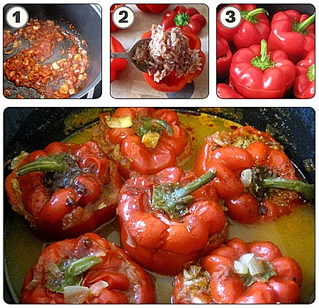 פלפלים אדומים ובוהקים, שוחים ברוטב עגבניות עשיר וממולאים בבשר מתובל, אורז ובצל מטוגן