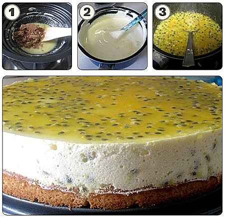 2. מכניסים את תוכן הפסיפלורה לסיר קטן, זורים מעל את הג'לטין, מחממים וממיסים.