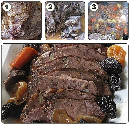6. מחזירים את הבשר ויוצקים מעל את היין, מרתיחים, מנמיכים את הלהבה ומבשלים שעה. לאחר שעה מוסיפים את הפירות היבשים ומבשלים עוד שעה עד שהבשר רך.