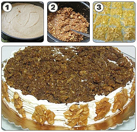קינוח מרשים לראש השנה - שכבות של עוגה עסיסית במילוי קצפת וציפוי של אגוזים שמתפצפצים בפה. וגם: קישוט מיוחד של פרחי שקדים מקורמלים