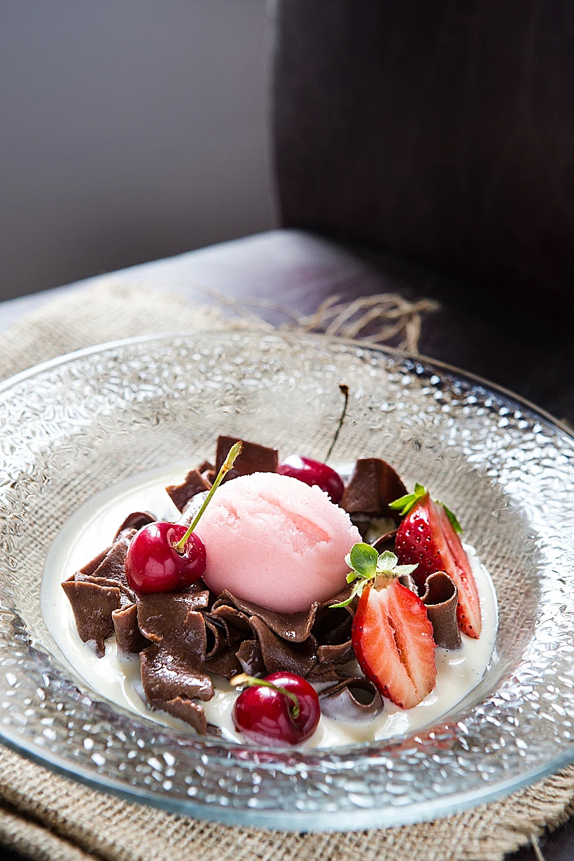 אניולוטי שוקולד,במילוי ריקוטה,רוטב תותים וגלידה וניל
