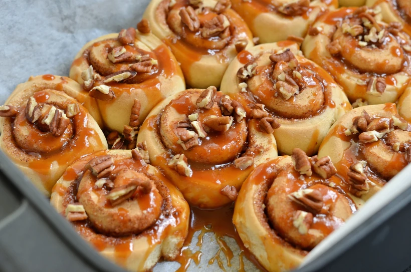 4. מצפים את הסינבונים בתערובת הקרמלית. אם רוצים מוסיפים פקאן לפריכות המושלמת. מצננים על רשת ולא מתאפקים.