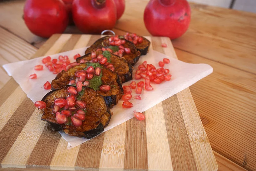 - מרכיבים את המנה: מסדרים יפה על צלחת, מעל לכל חציל מזלפים מעט פסטו ומקשטים בגרגרי רימון.