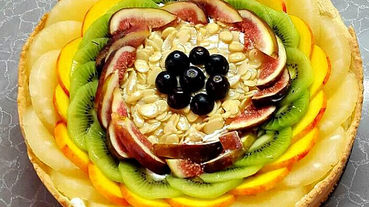 טארט מרהיב וטעים, העשוי מבצק פריך, במילוי קרם וניל, ומקושט מפרוסות אננס, נקטרינה, קיווי, תאנים, שבבי שקדים קלויים וענבים שחורים
