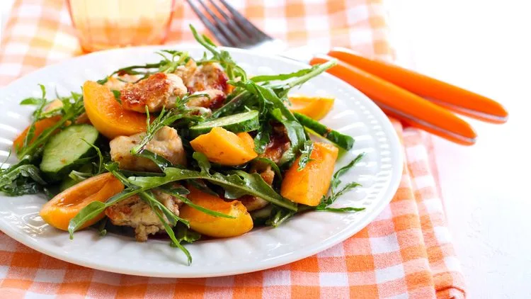 סלט קראנצ'י ומפוצץ טריות ששייך לז'אנר הקלילים אך משביעים. דמיינו לעצמכם צלחת צבעונית שבבסיסה ירקות טריים וקריספיים, ועליהם נתחי חזה עוף במרינדה ים תיכונית מתקתקה. רגע לפני ההגשה מוסיפים משמשים טריים שאחראיים על חמיצות מרעננת ומלא עסיס. התוצאה יפה, מגרה ובעיקר טעימה ומוציאה את סלט הירקות הקבוע מהקופסה. למתכון המלא - לחצו כאן.