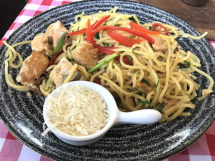 הזמנתי שתי מנות פתיחה: פרחי ארטישוק במרינדה וקרפצ'ו פילה בקר, ומנה עיקרית: פסטה אמלפי – ספגטי ברוטב יין לבן, שום, צ'ילי, שמן זית ונתחי דגים. את הזמן שעבר עד שהגיעו, ותאמינו לי עבר לא מעט זמן, ביליתי בהאזנה ליושבי השולחנות סביבי. אין לי מושג אם זו טעות, מדיניות או עניין של חוקים ותקנות, בחצר של 'ג'יארדנו בלו', אין מוזיקה שתבלע את הדיבורים מהשולחנות השכנים. כך שמפה לשם זכיתי להתעדכן בחיי המין של כמה גברים צעירים, שנראה כאילו הם באים לשם הרבה, ובמקביל גם בבעיות עיכול של שתי נשים קצת יותר מבוגרות, שישבו בצד השני. גם הן אם לשפוט על פי עוצמת הדיבור שלהן ונושאי השיחה, הרגישו בבית.