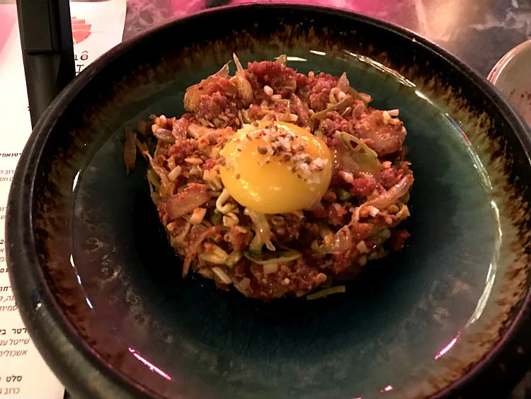 אל מנת הספרינג רול, שני רולים מאורכים שהכרוב האדום, או שמא התאורה, העניקו להם צבע וורדרד, ניגשתי בהתאם להוראות ההפעלה שנמסרו על ידי המלצרית. עטפתי את הרול בעלה חסה, הוספתי כוסברה ונענע וטבלתי הכול ברוטב הצ'ילי והליים. הירקות הטריים, עשבי התיבול והרוטב החמוץ חריף, יצרו שילוב מרענן, מאוזן ומשמח. אלה דברים שאפשר להגיד גם על סלט ירקות מושקע, וזו לדעתי הדרך הנכונה להתייחס למנה הצנועה הזו. טרטר הבקר שסומן בתפריט בפלפל אדום קטן כדי להרתיע את מי שפחות אוהב חריף הוגש בקערית עגולה עם מלפפון קצוץ, שעועית, אשכולית, למון גראס, צ'ילי, חלמון ושברי בוטנים. הוא היה חמצמץ, מתוק וחריף, במידה שאפשרה לטעמי הבשר להתבטא, והחלמון, עשה את מה שחלמונים יודעים לעשות, איחד בין המרכיבים, ספג את הטעמים, מיתן אותם וגרם להם להדהד בחיך, דקות ארוכות אחרי כל נגיסה. הצצה בשעון גילתה שנותרו לי רק שלושים דקות סטנדרטיות ונראה היה לי שאספיק אפילו קינוח.