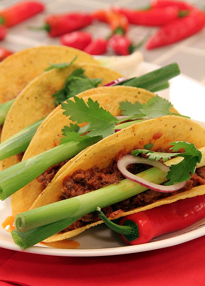- ממלאים את הטאקוס (הטורטיות המוכנות למילוי), או מניחים במרכז טורטיות ומגלגלים, מוסיפים מעל כל טאקו בצל ירוק לקישוט וגבעול כוסברה.