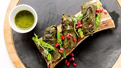 עלי גפן גאורגיים על מח עצם וקרם שזיפים
